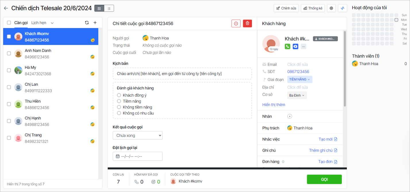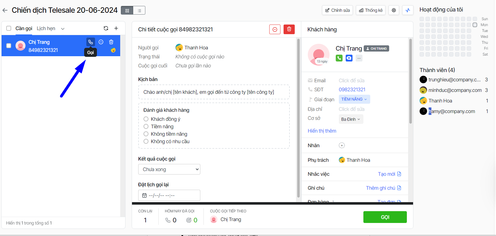 - Bước 2: Agent bấm nút Gọi điện lần lượt cho từng khách hàng. Nhập các thông tin khách theo kịch bản. Chọn kết quả cuộc gọi và đặt lịch gọi lại nếu cần.