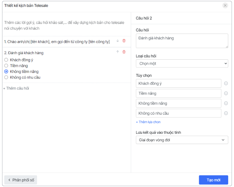 - Bước 5: Thiết kế kịch bản telesale. Quản lý thêm các câu hỏi để thành viên nói chuyện và hỏi thông tin khách hàng theo quy trình có sẵn.