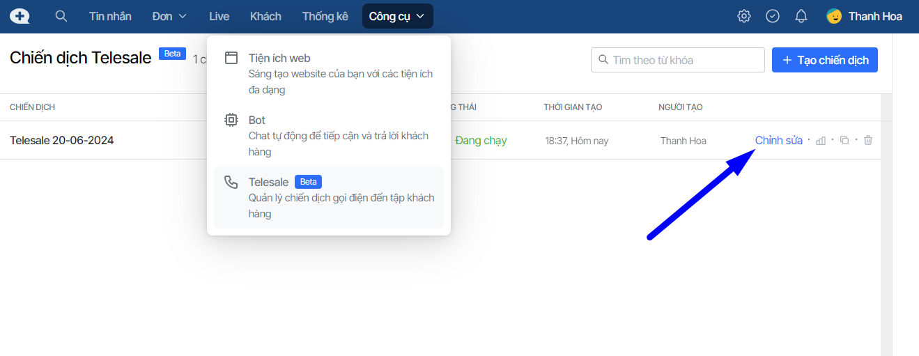 - Bước 1: Mở trang Telesale, bấm nút Chỉnh sửa chiến dịch