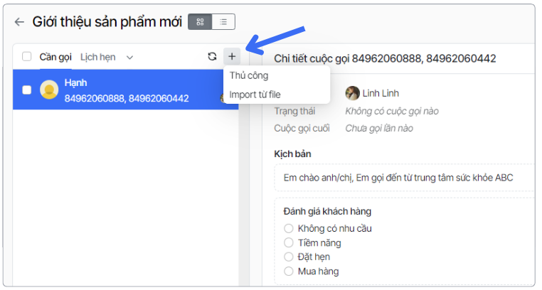 Bước 3: Nhập danh sách SĐT cần gọi điện telesale.Có thể chọn khách đang có trên Subiz hoặc tải file khách hàng lên Subiz
