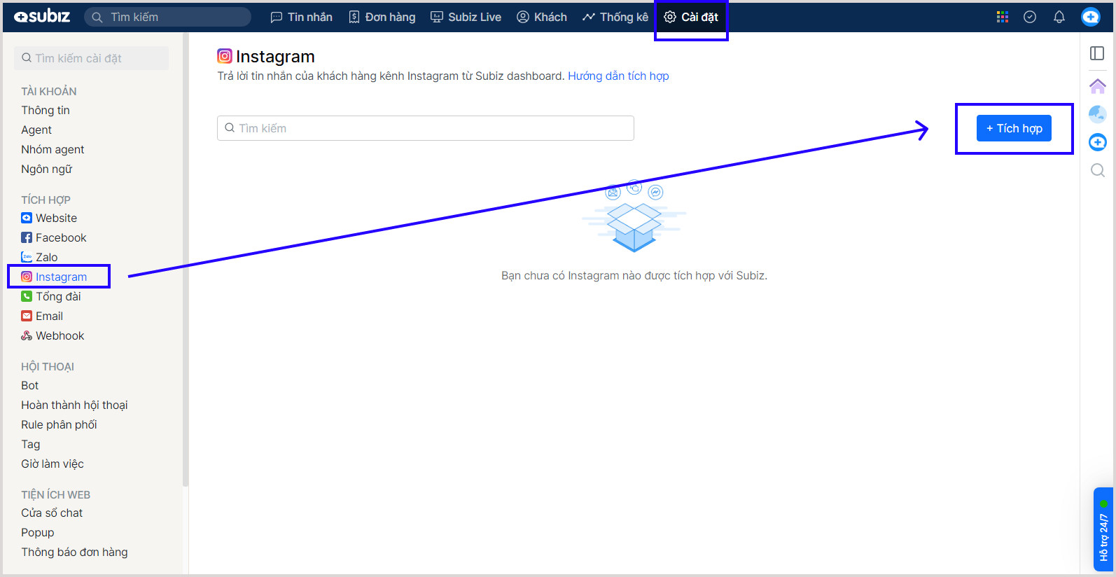 • Đăng nhập Subiz > Mở Cài đặt > Chọn Tích hợp Instagram