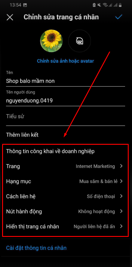 • Chọn 'Chỉnh sửa trang cá nhân' > trong phần 'Thông tin công khai về doanh nghiệp’ nhấp vào 'Trang' > từ đây, hãy kiểm tra kỹ xem trang Instagram có được kết nối với đúng Fanpage hay không. Nếu không, bạn sẽ cần kết nối một Fanpage đang có hoặc tạo một Fanpage mới.
