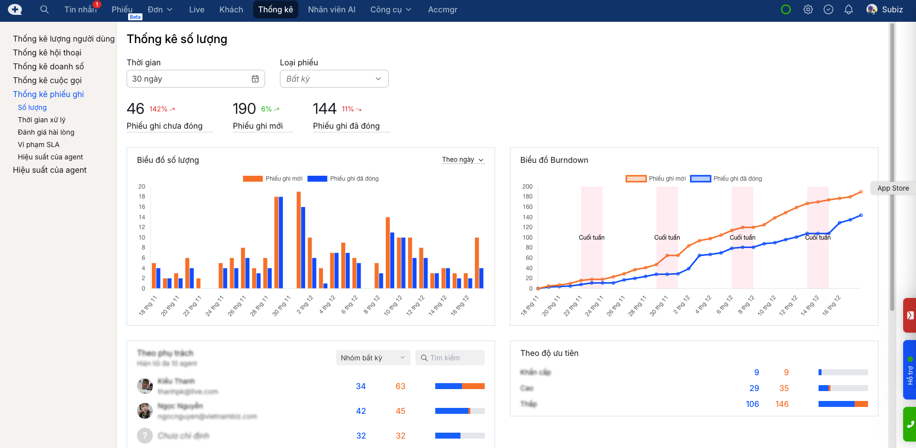 Thời gian trung bình cũng sẽ được phân loại theo: người phụ trách, theo mức độ ưu tiên cũng như số lượng.