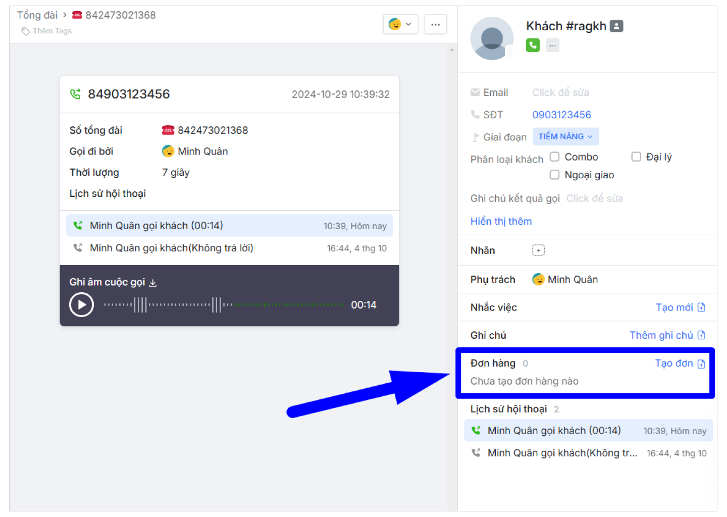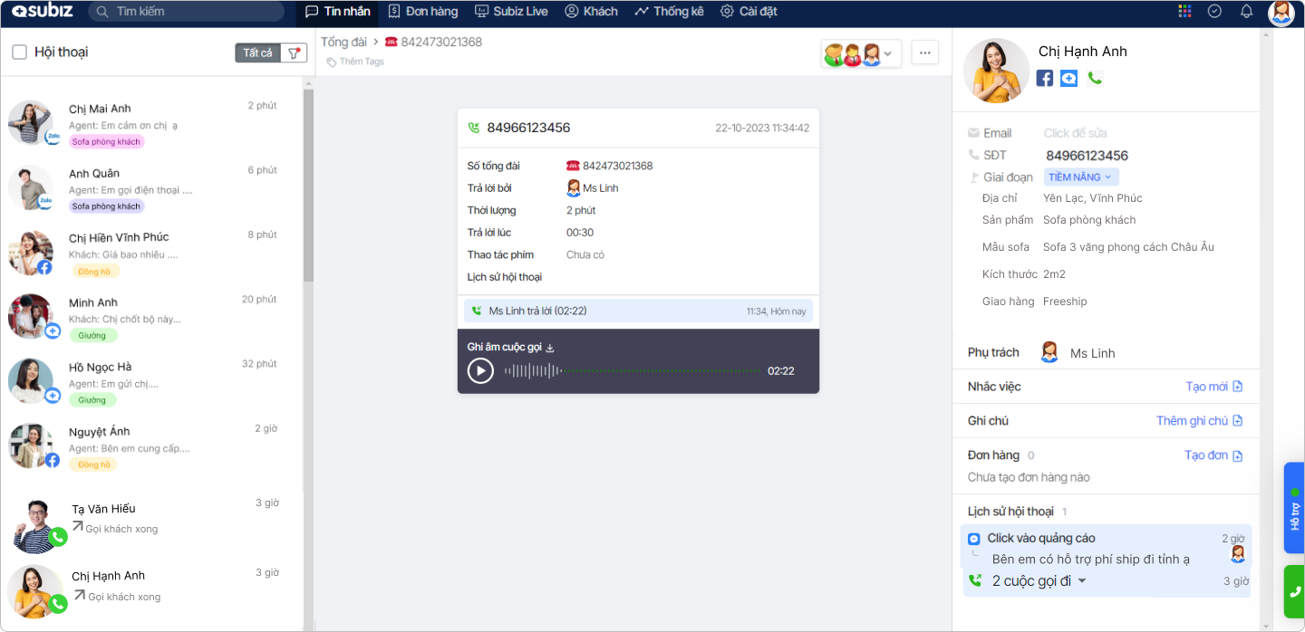 Agent có thể gọi điện và chốt đơn hàng, sau đó ghi nhận đơn hàng ngay trên Subiz. Cụ thể các bước như sau: