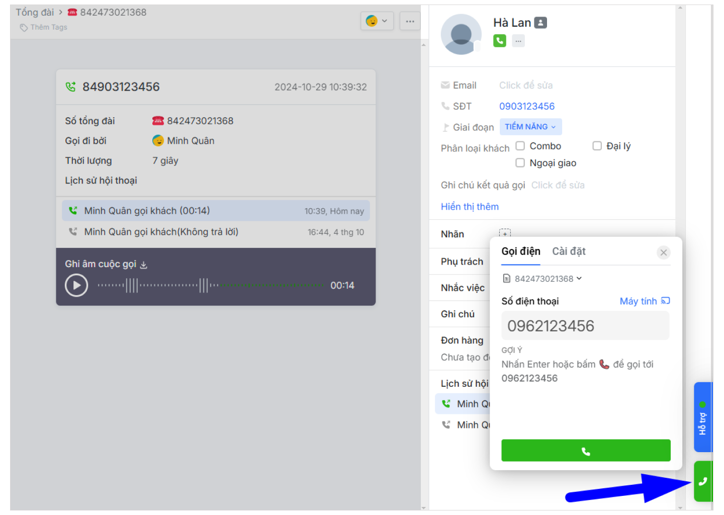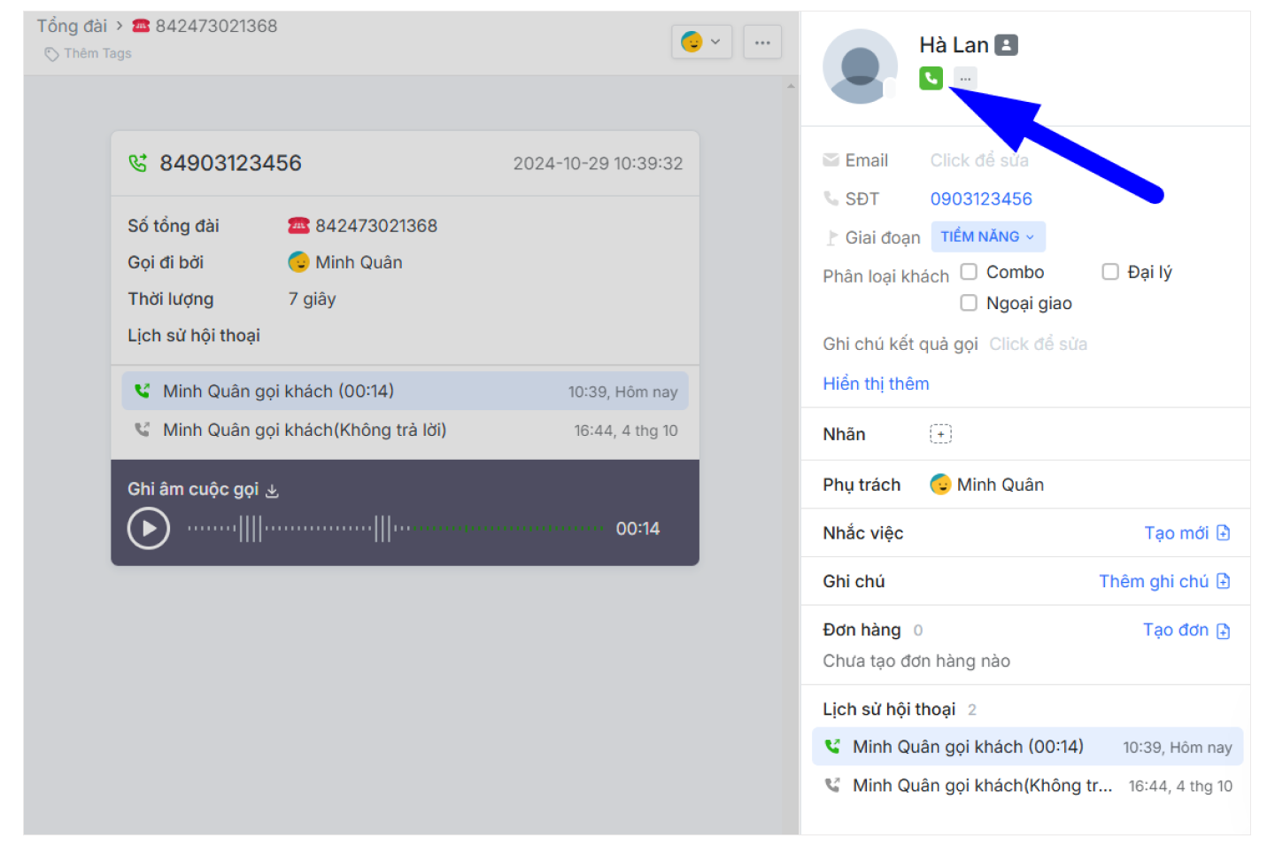 Nếu khách hàng đã lưu SĐT trên Subiz thì agent nhấp nút GỌI ở ngay dưới họ tên khách.
