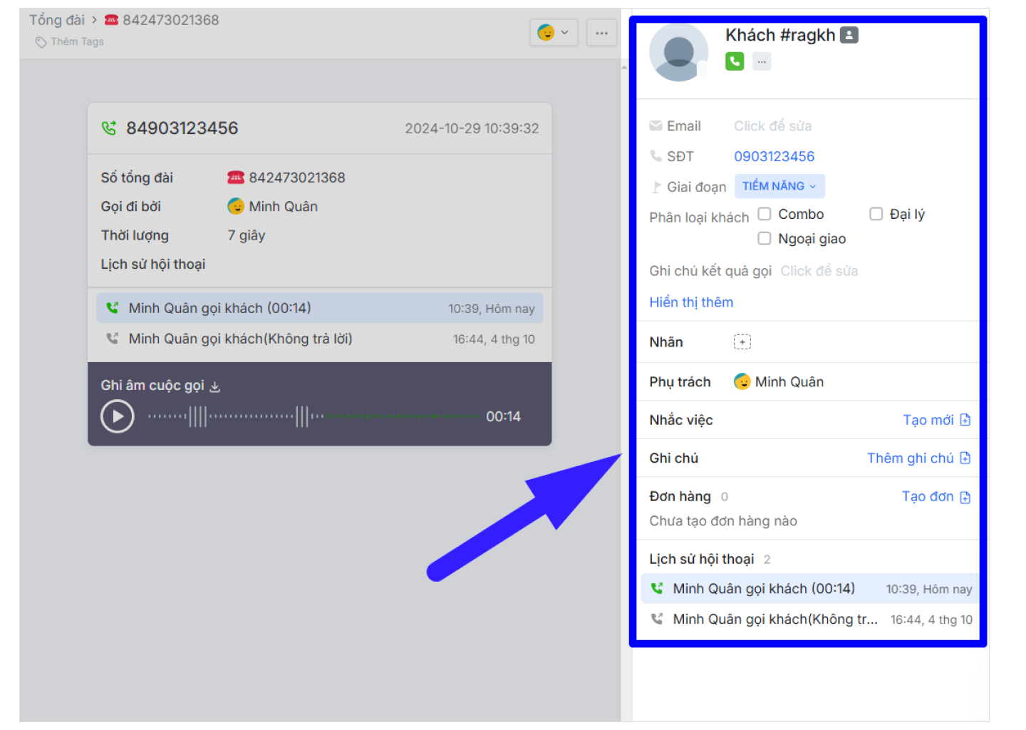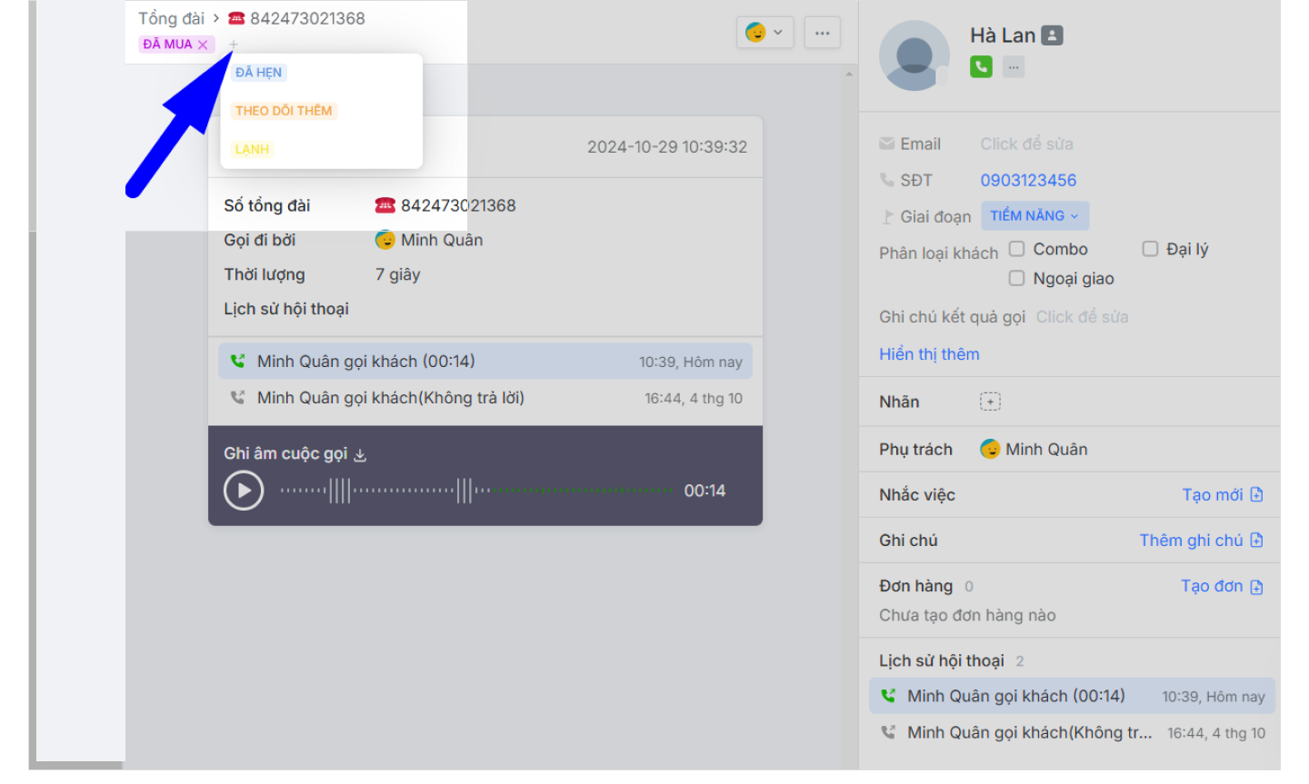 Tag giúp phân loại các cuộc gọi theo chủ đề. Ví dụ như cuộc gọi về Tư vấn sản phẩm, báo giá, bảo hành- kỹ thuật.