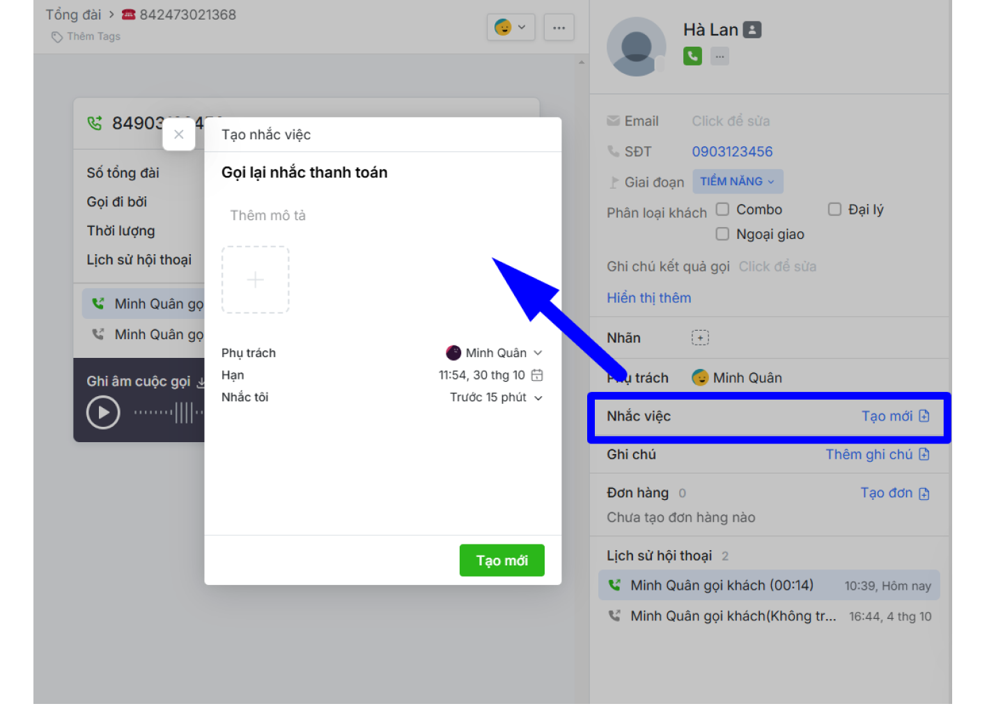 Bạn có thể tạo nhắc việc để ghi nhớ các công việc cần làm bằng cách mở hồ sơ khách hàng và nhấn nút “Tạo mới” cho Nhắc việc.