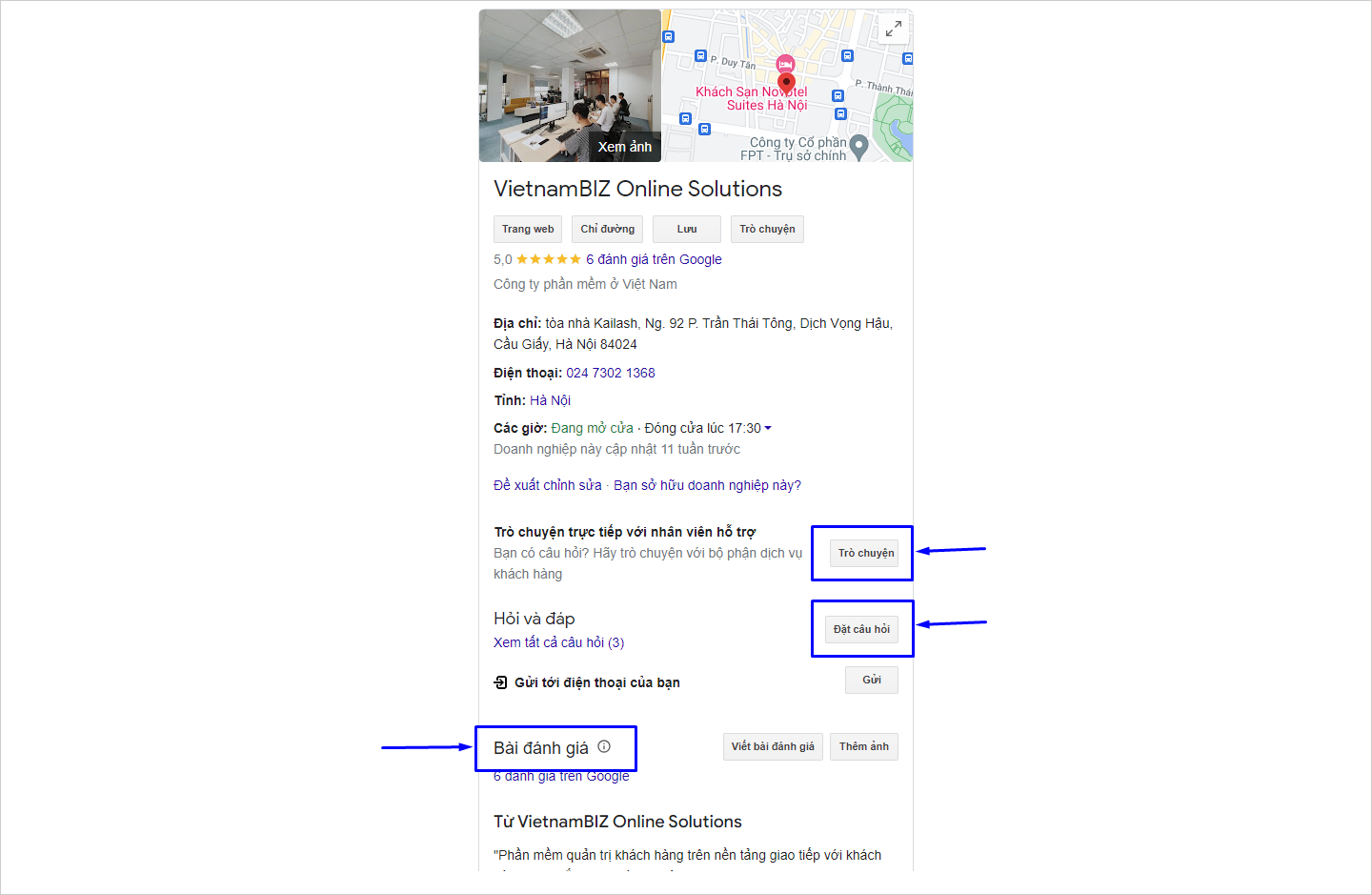Ví dụ trang Doanh nghiệp VietnamBIZ Online Solutions trên Google có 3 chức năng tương tác khách hàng là Trò chuyện, Đặt câu hỏi và Viết bài đánh giá.