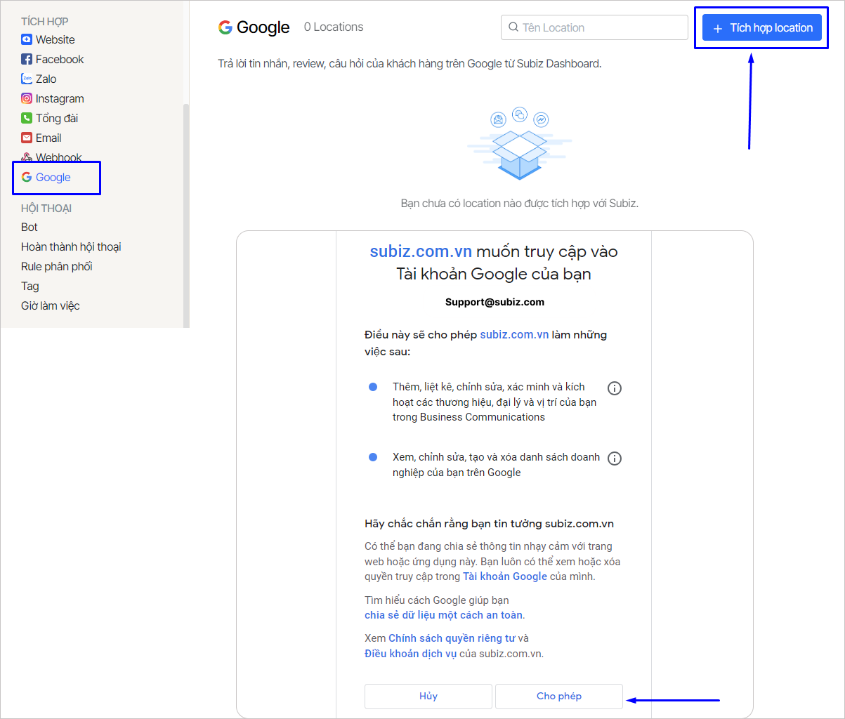 - Đăng nhập email quản lý Trang Doanh nghiệp trên Google > Chọn Cho phép Subiz thực hiện các việc quản lý